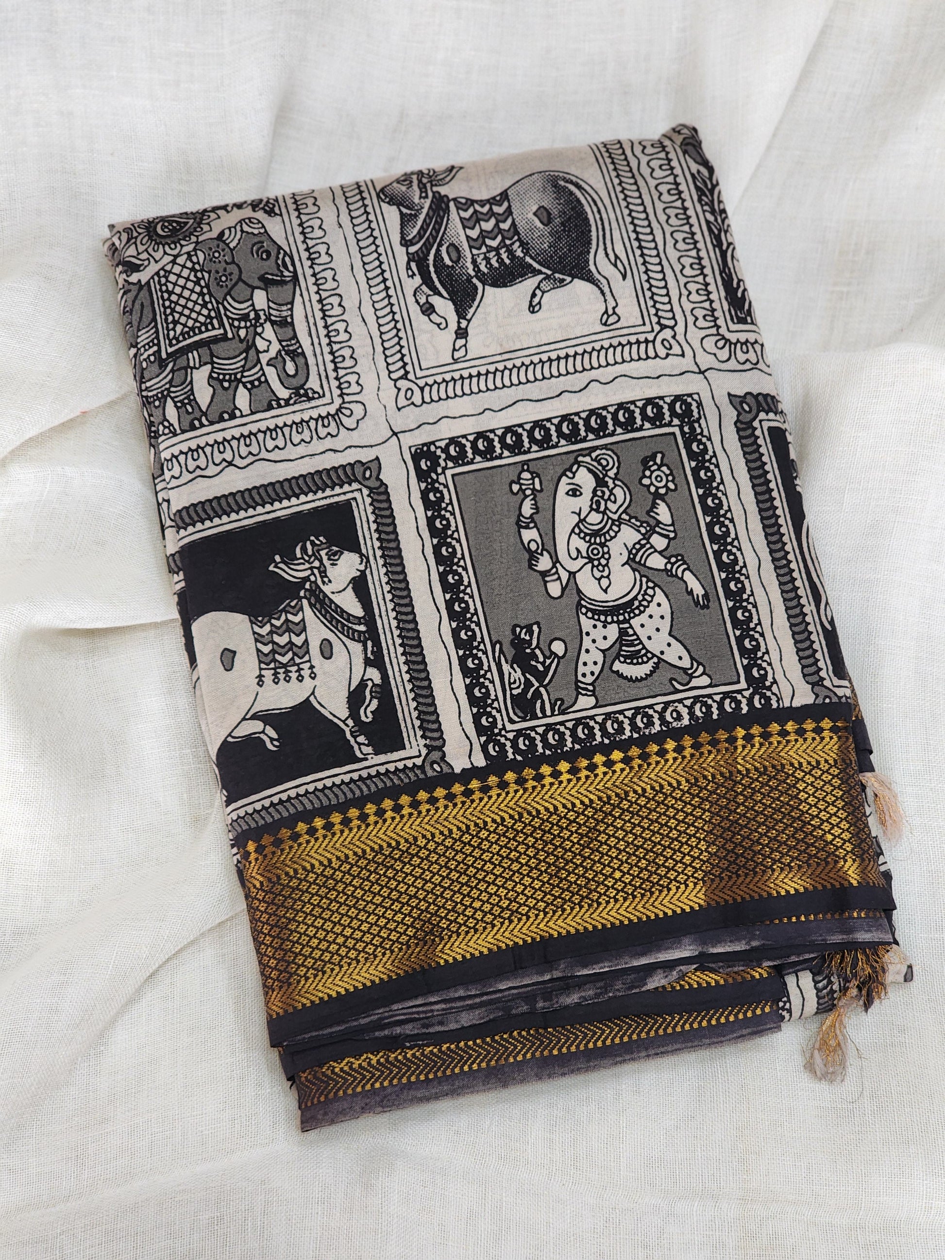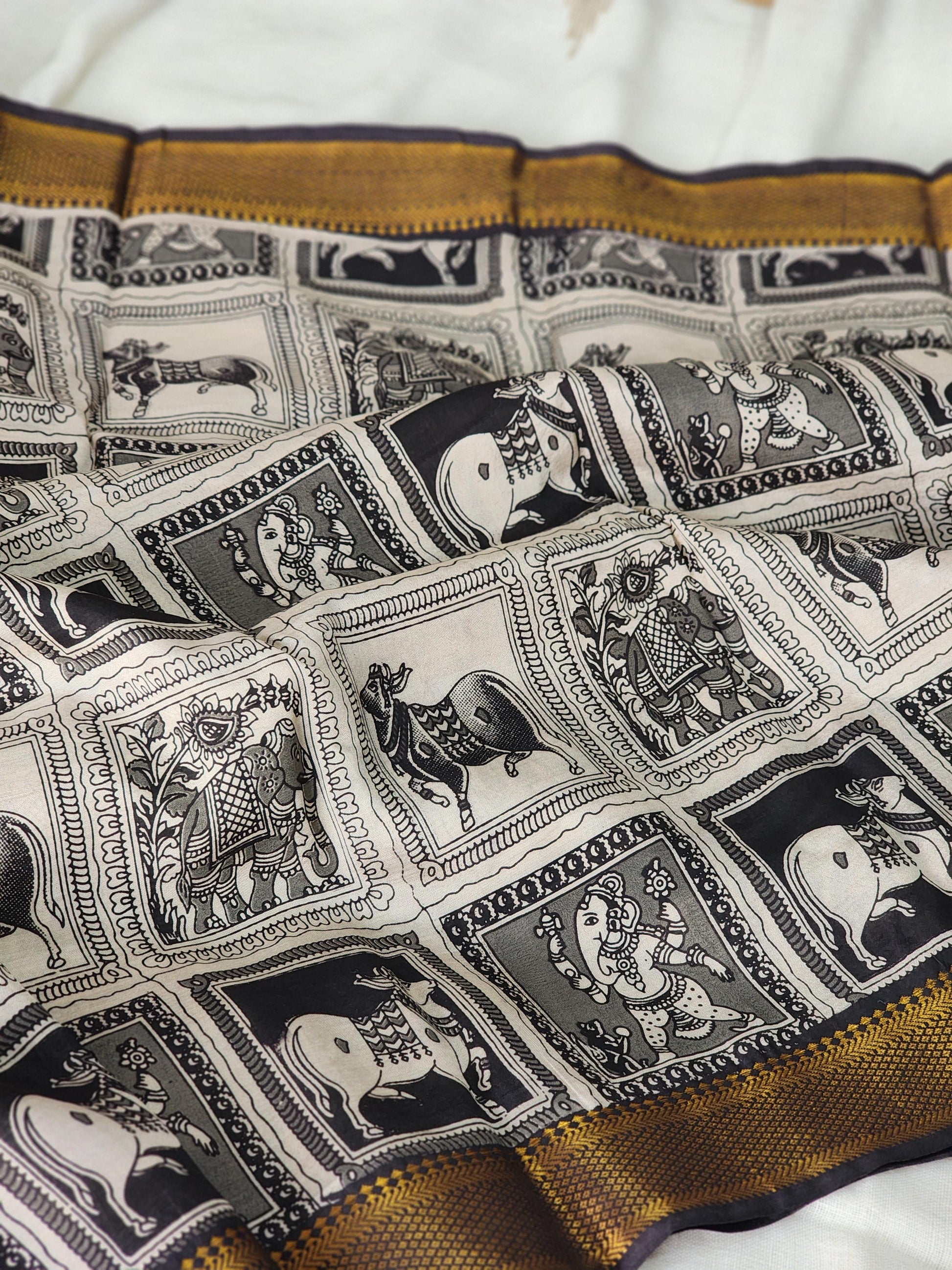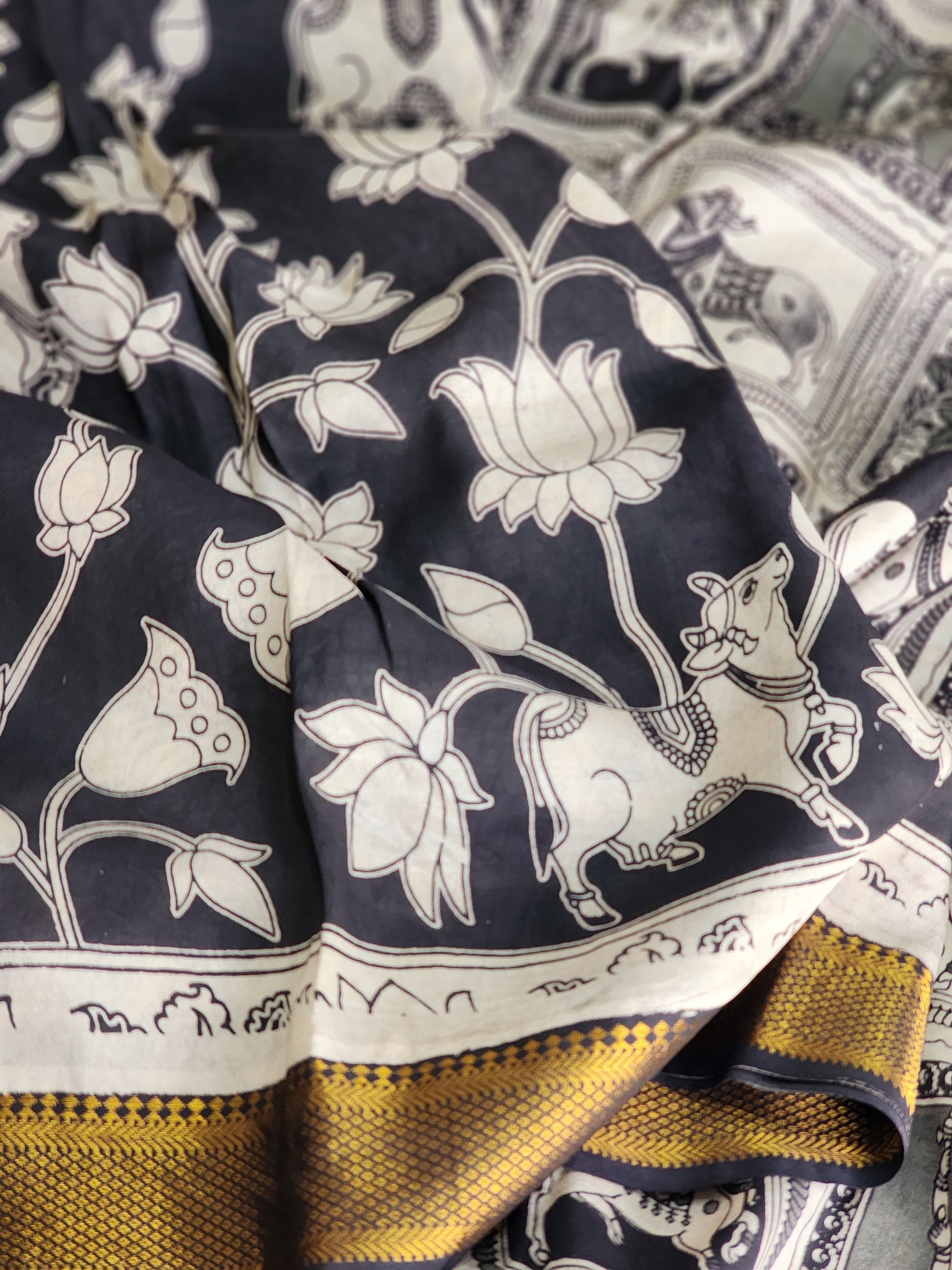 Immerse yourself in the captivating world of Kalamkari artistry with our silk saree with Nizam border . Each inch of this saree showcases the meticulous skill and dedication of our weavers, ensuring you own a piece of wearable art.