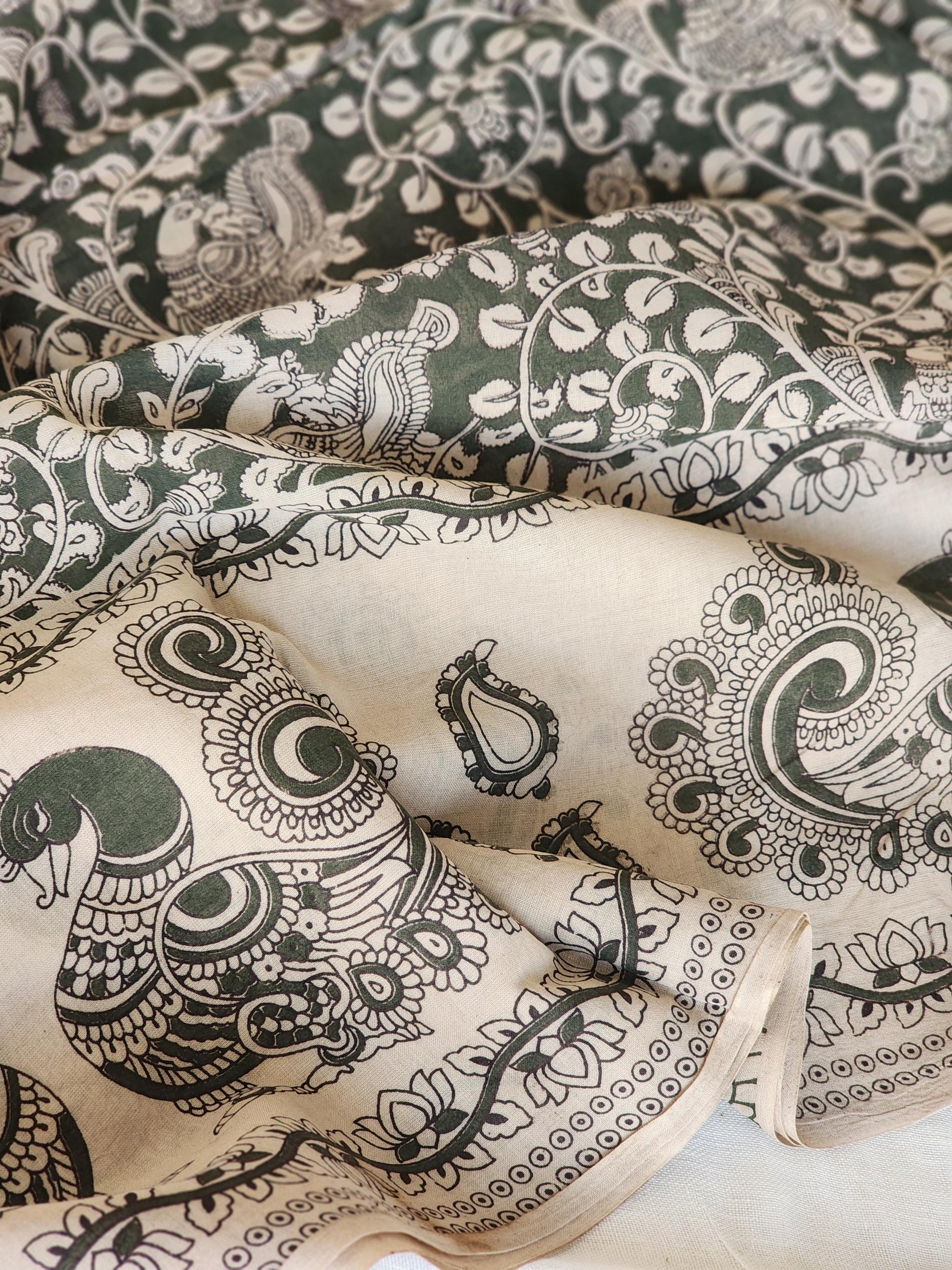 Immerse yourself in the captivating world of Kalamkari artistry with our cotton saree. Each inch of this saree showcases the meticulous skill and dedication of our weavers, ensuring you own a piece of wearable art.
