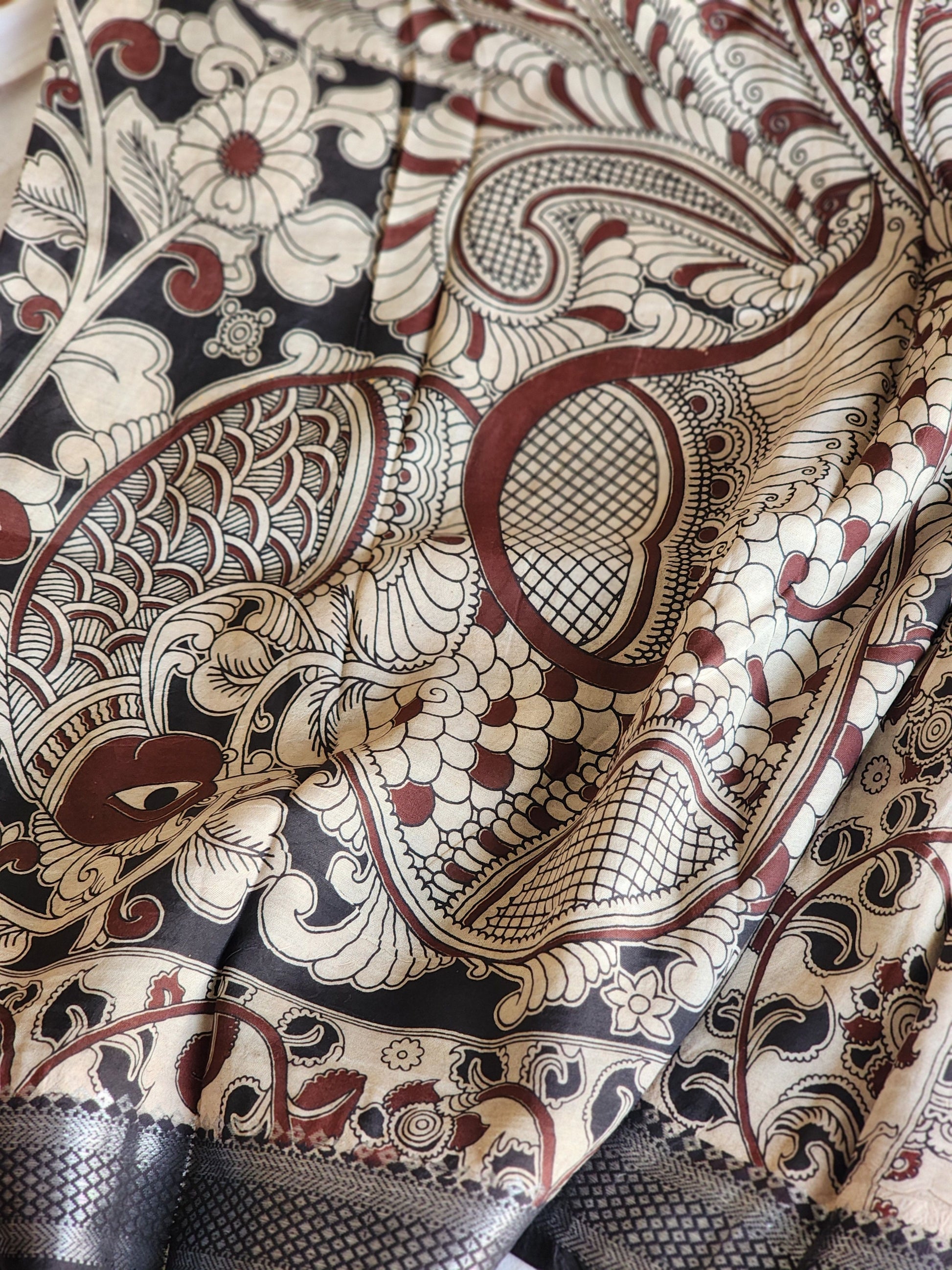 Immerse yourself in the captivating world of Kalamkari artistry with our silk saree with Nizam border . Each inch of this saree showcases the meticulous skill and dedication of our weavers, ensuring you own a piece of wearable art.